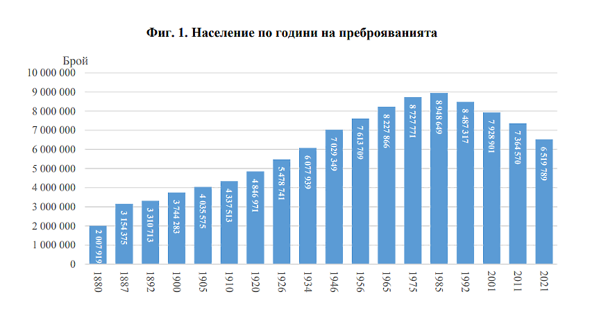 В периода между последните две преброявания населението на България се е стопило с 844 781 души, или с 11,5%. Резултатите показват, че средногодишният темп на намаление на година се увеличава от 0,7 през периода 2001 - 2011 г. на 1,2 през периода 2011 - 2021 година, посочват от НСИ.