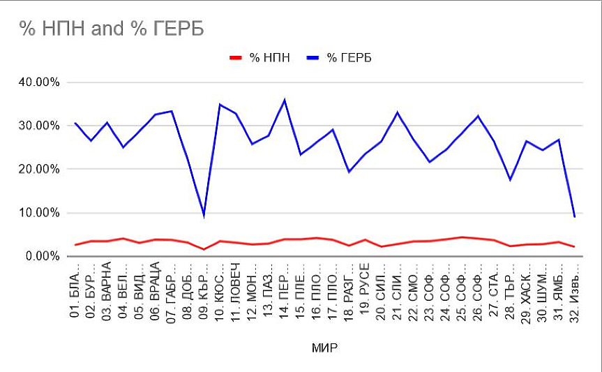 И добавя, че водещите в Нова тв по време на участието на Биков също са хванали проблема в графиката му - напълно нормално е колкото е по-голям избирателният район, толкова повече да са гласовете за ГЕРБ и повече за "Не подкрепям никого". Няма корелация между двете, демонстрира Божанов с реално сравнение на процентите и своя графика: