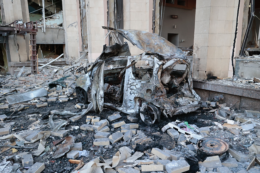Повреден е главният вход на сградата, унищожени са и няколко автомобила, уточни в канала си в "Телеграм" градската администрация.