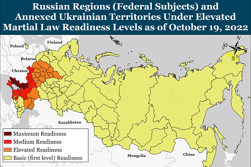 Указът на Путин предвижда в четирите анексирани области, където е въведено военно положение, да бъдат създадени щабове за териториална отбрана, чиито функции не са уточнени. Той позволява в районите с повишена и средна готовност за реагиране, т.е. пограничните с Украйна и Крим, областните управители да организират териториална и гражданска отбрана. Това може да се окаже скрита форма на мобилизация на населението, чието придвижване военното положение ограничава.
