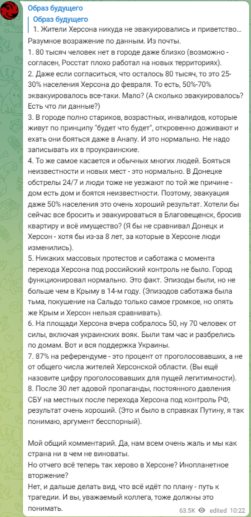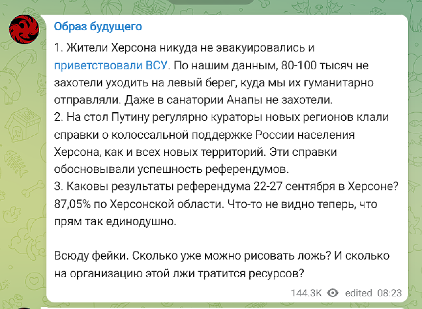 "Вчера на площада в Херсон се събраха 50, ако не - 70 души, включително украинските войски. Останаха там един час и после се прибраха по домовете. Това е цялата подкрепа за Украйна", уверява "Образ будущего" и добавя: "87% на референдума - това са процентите гласували, не общият брой жители на Херсонската област".
