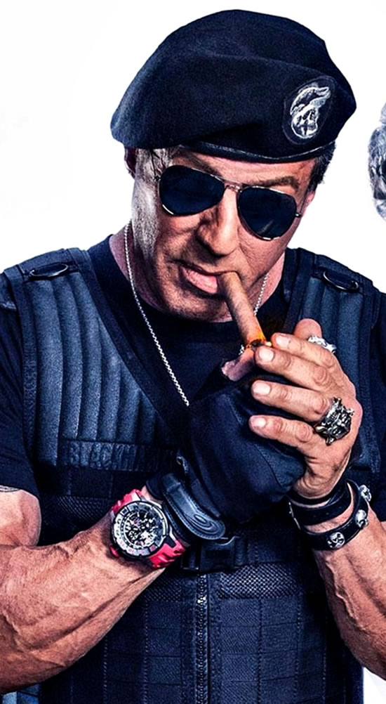 Сталоун продължава да е верен на Panerai, като носи модели на марката и във всичките серии на "Непобедимите". Но в третата част се показва и с уникален Richard Mille RM 032 с червена каишка.