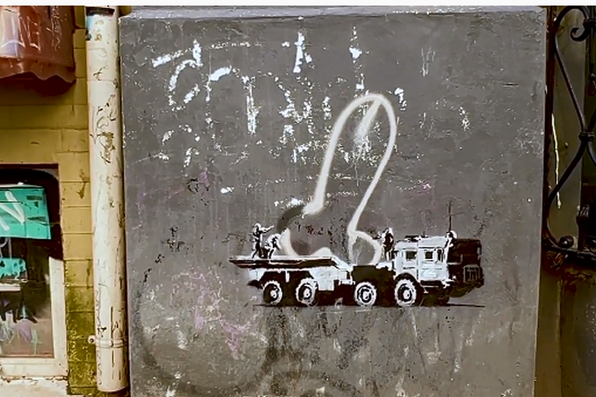 Освен вече показаните изображения на гимнастички, малко момче, което мята на земята с хватка от джудото фигура, силно приличаща на Путин, деца, които използват за люлка метални елементи, сега той показва още няколко от графитите си. Сред тях тях жена с ролки на главата и противогаз, както и неговата версия на "Иди на*уй" с военна машина със знака Z.