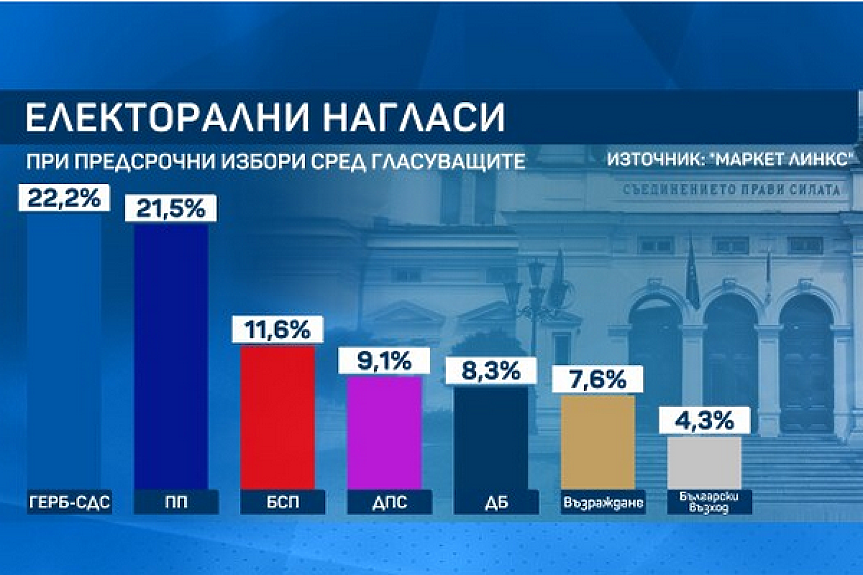ГЕРБ и "Продължаваме промяната" приближават позиции като разликата между тях е под 1 процент. Вземат съответно 22,2 на сто и 21,5 на сто от гласовете, ако изборите бяха днес.