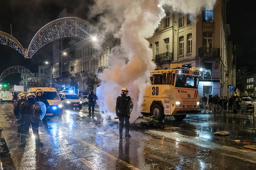 Тълпи предизвикаха безредици в центъра и други райони на Брюксел, което принуди полицията да разположи водни оръдия и използва сълзотворен газ, предаде АП.