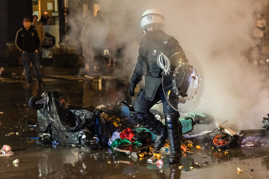Десетки хулигани запалиха факли, чупиха витрини на магазини и замеряха автомобили с тухли. Пострадаха коли, магазини и офиси. Полицията се намеси, след като човек получи наранявания по лицето, каза говорителката на полицията Илзе Ван де Кере.