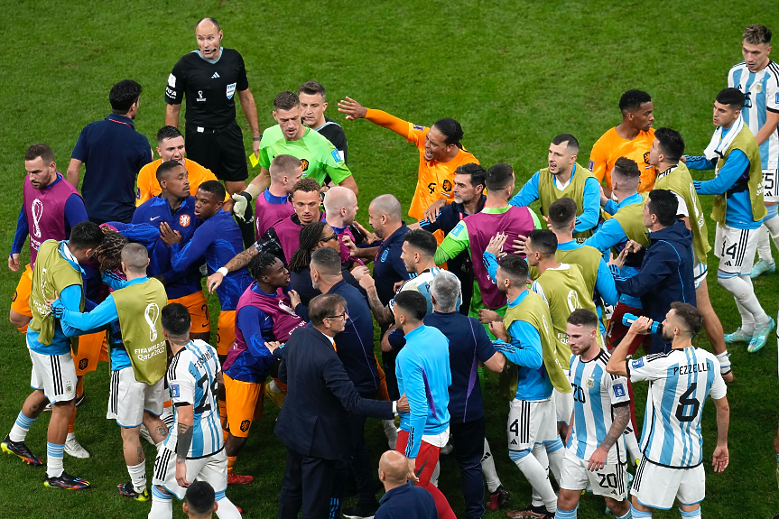 С 18-те си жълти и един червен картон мачът постави рекорд в Катар 2022. От тях осем жълти са на Нидерландия и един червен на Дензъл Дъмфрис, показан след дузпите. Осем “заслужиха” и аржентинците, но добавяме още два на селекционера Лионел Скалони и неговия асистент Валтер Самуел.