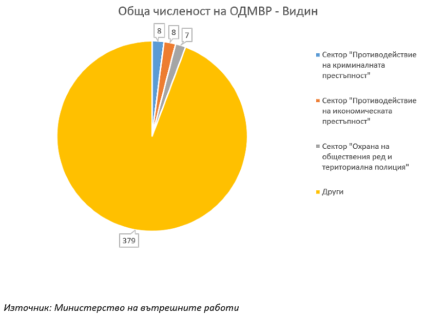 В Областната дирекция на МВР-Видин работят над 400 човека, от тях 23-ма са тези на терен, заети с охраната и противодействието на престъпността, по данни на МВР. Инак поредният вътрешен министър е направил поредната успешна реформа в МВР. От тия 23-ма 8 се занимават с икономическата престъпност, тоест не стъпват по селата, където е ясно, че се краде, бие и убива. Или поне това показват данните от статистиката на МВР.