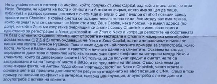 В текста, изпратен от Шулев на част от екипа на Nexo, има твърдения, че компанията стои зад сайта на Zeus Capital, който публикува очернящ анализ за проекта Chainlink. Според Шулев неговите съдружници Коста, Антони и Калин по този начин са извършили пазарна манипулация и злоупотреба с активи на клиенти. Прокуратурата обаче не беше словоохотлива по тази тема, която вълнува отдавна криптообщността.