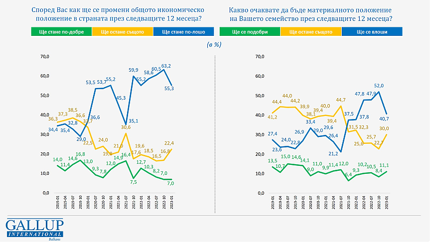 Това не означава, че българите са станали изведнъж оптимисти - 55,3% от анкетираните все още смятат, че общото икономическо положение в страната ще се влошава. Но това е спрямо 63,2% през есента. Тогава 16,8% са смятали, че няма да има промени, сега са 22,4%. Оптимистите всъщност са същия дял - 7% от анкетираните.