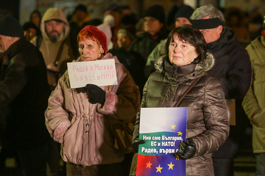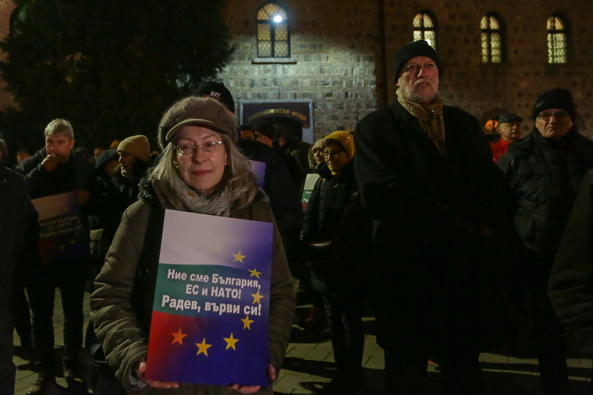 Протестиращите скандираха “Оставка” и държаха плакати, на които пишеше “Радев вън! Предател!”, “Радев е приятел на Дявола”, както и “Ние сме България, ЕС и НАТО. Радев, върви си!”