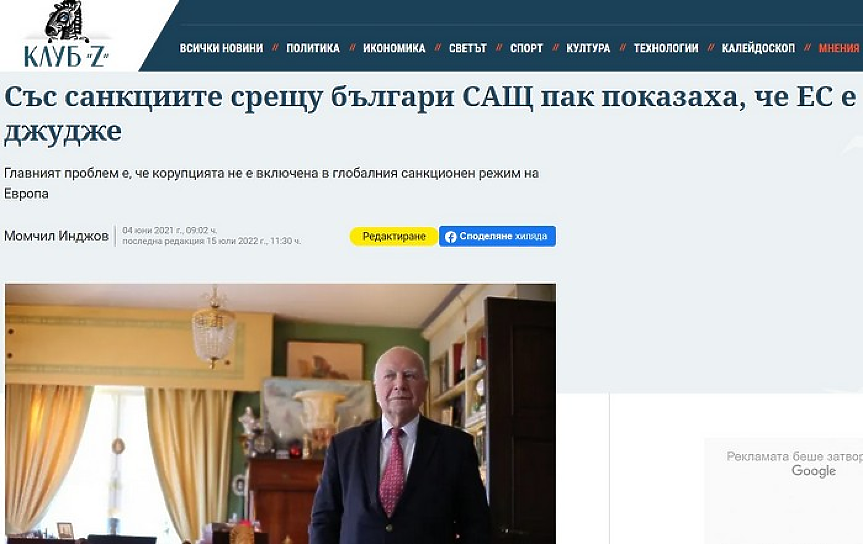 Този коментар е публикуван в Клуб Z на 4 юни 2021 г. Поводът бяха наложените от САЩ санкции срещу Делян Пеевски, Васил Божков и Илко Желязков по „Закона Магнитски“. Преди два дни САЩ санкционираха други петима българи по същия закон. И в двата случая причината е корупция. И в двата случая ЕС не може да направи нищо, тъй като корупцията не влиза в обхвата на неговия санкционен режим, насочен единствено срещу нарушенията на правата на човека. Няма никаква промяна и до днес. Затова отново публикуваме този стар текст.