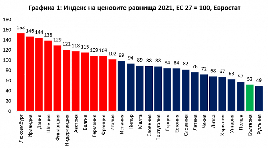 Най-общият поглед се предоставя от изчисленията на Евростат на индекса на ценовите равнища в 27-те европейски страни. При него спрямо имагинерно средноевропейското ценово равнище се сравняват средногодишните цени в останалите държави. Практически, средноевропейското ценово е много близко до това в Испания (99) и Италия (102), а повечето западноевропейски страни с изключение на Португалия се нареждат над него. Обратно, с най-ниски средни цени са Румъния (49) и България (52), което означава, че средните цени са наполовина по-ниски от средното за ЕС равнище. Необходимо е и да направим уточнението, че заради голямото забавяне в публикуването на данните от страна на Евростат представеното тук е за 2021 г., но предвид повсеместната и относително равномерна инфлация през 2022 г. няма основания да очакваме големи размествания в класирането и отстоянията.