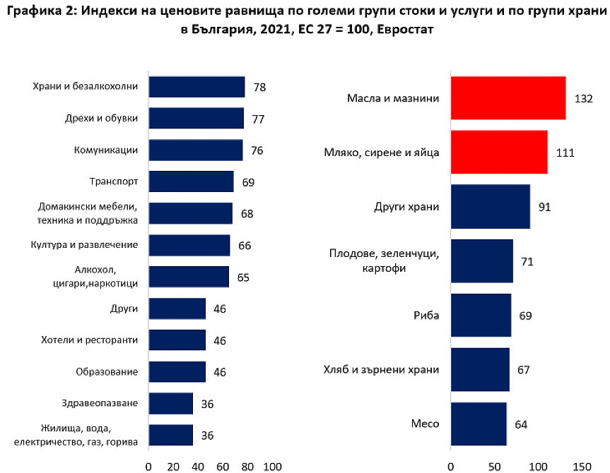 Още по-интересно е разпределението в рамките на групата на хранителните стоки, които и най-често стават обект на сравнения. Докато при месото средната цена е 64% от тази на ЕС-27, при хляба – 67%, то има две групи стоки при които цените в България през 2021 г. са били над средните. Това са маслата и мазнините – 132% и млякото, сиренето и яйцата – 111%. Въпреки че още в средата на миналото десетилетие цените на яйцата и млечните продукти минават 90% от средноевропейските, през 2020 г. в хода на ковид кризата те вече са над средните. При мазнините и маслата изравняването пък изравняването се случва още през 2013 г. Предвид, че именно при тези групи е и съсредоточен значителна част от ръста на цените на храните през 2022 г., най-вероятно това отношение ще се запази.