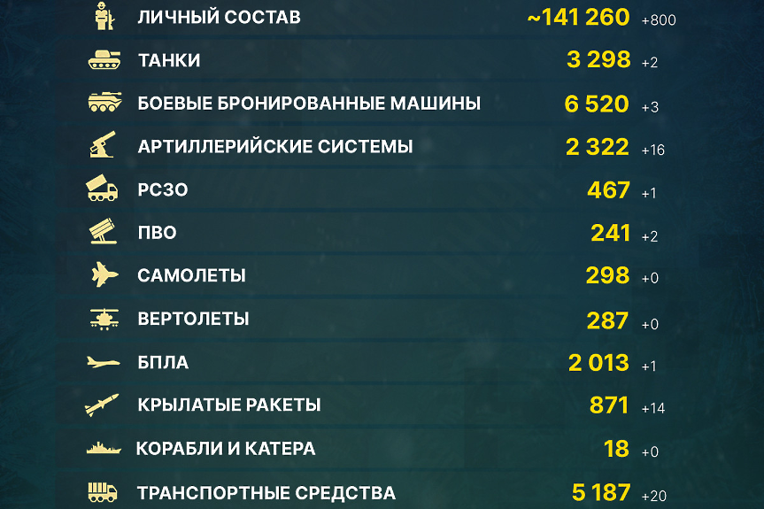 На 16 февруари Русия е загубила 800 военни, с което общите ѝ загуби на жива сила за почти година война са вече са 141 260 души - убити и ранени - според разпространената във Фейсбук сводка на украинския генерален щаб, чиято достоверност не може да бъде независимо потвърдена.