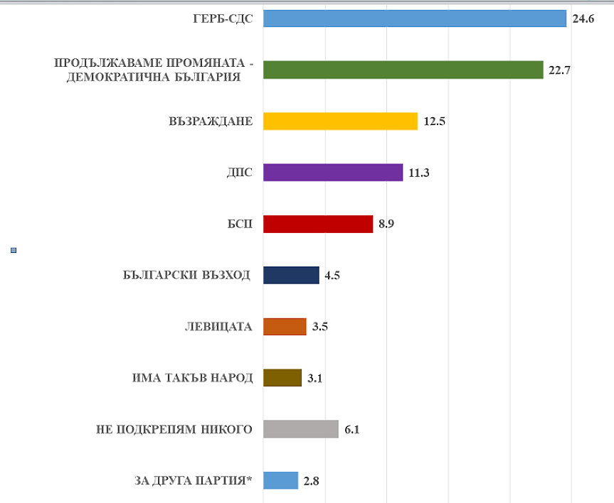 24,6 процента от запитаните биха предпочели ГЕРБ-СДС. Коалицията „Продължаваме промяната"- "Демократична България“ е с 22,7 на сто. Третата позиция на минимална преднина пред ДПС (но изследването не отразява гласовете от чужбина) е за „Възраждане“ - 12,5 на сто. ДПС е със 11, 3 процента, БСП – 8,9 на сто и „Български възход“ с 4, 5 процента.