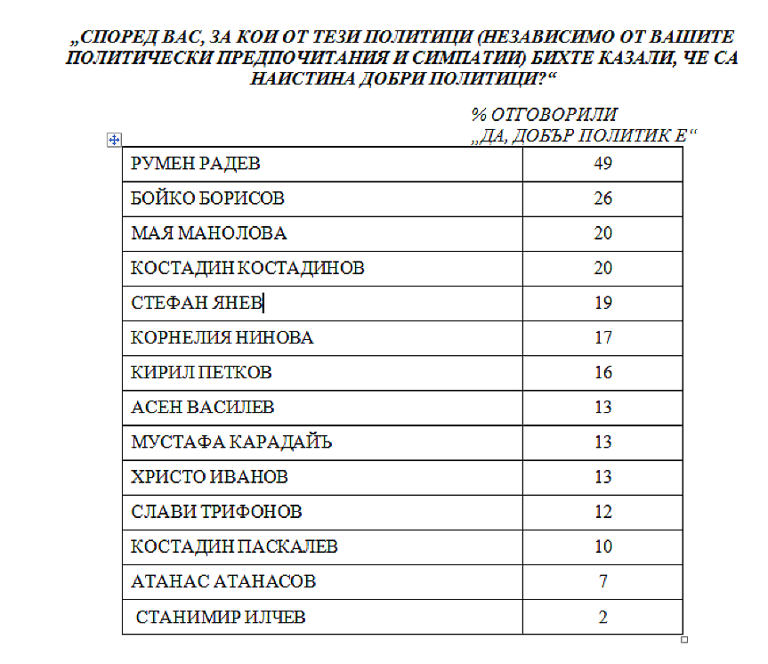 В рейтинга на политиците не се наблюдават значителни размествания. Общо 49 процента от запитаните одобряват президента Румен Радев. Той е следван от лидера на ГЕРБ Бойко Борисов с 26 процента положителни оценки. Председателят на „Възраждане“ Костадин Костадинов и Мая Манолова, лидер на „Изправи се.БГ“ получават по 20 процента доверие. Следва лидерът на „Български възход“ Стефан Янев със 19 на сто, а председателят на БСП Корнелия Нинова е със 17 процента одобрение.