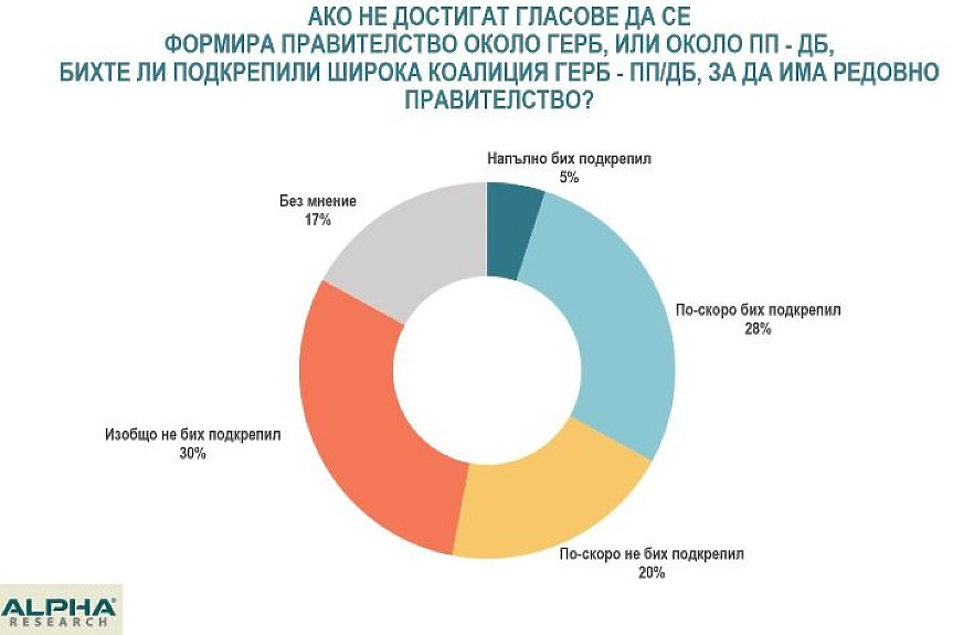 Евентуална широка коалиция между ПП-ДБ и ГЕРБ-СДС е категорично подкрепена от едва 5% от пълнолетните българи и още 28 на сто я приемат за възможен компромис, като изразяват умерено одобрение за нея.