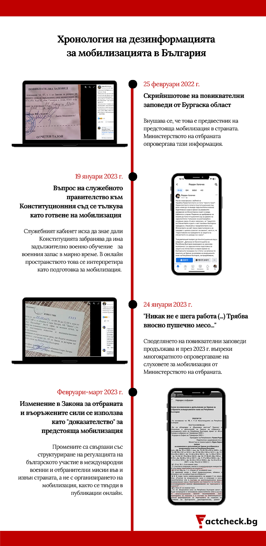 Министерството на отбраната (МО) неведнъж опроверга слуховете за предстояща мобилизация на цивилни мъже в България. Това обаче не възпрепятства разпространяването на дезинформация по темата и до днес.