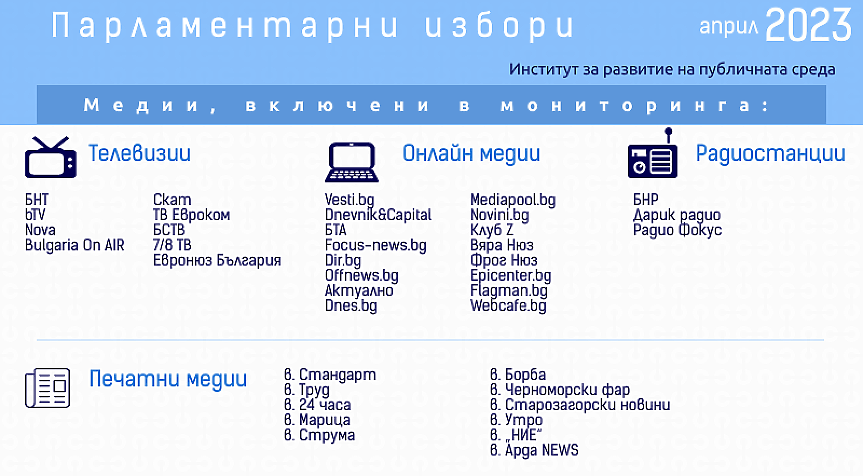 На тези и други въпроси търси отговор в традиционния за Институт за развитие на публичната среда (ИРПС) мониторинг на медийната реклама по време на предизборната кампания. В него са включени официалните страници на 39 национални и регионални медии – 9 телевизии, 3 радиостанции, 11 вестника и 16 информационни сайтове и агенции. (Кои са те може да видите в следващата графика).
