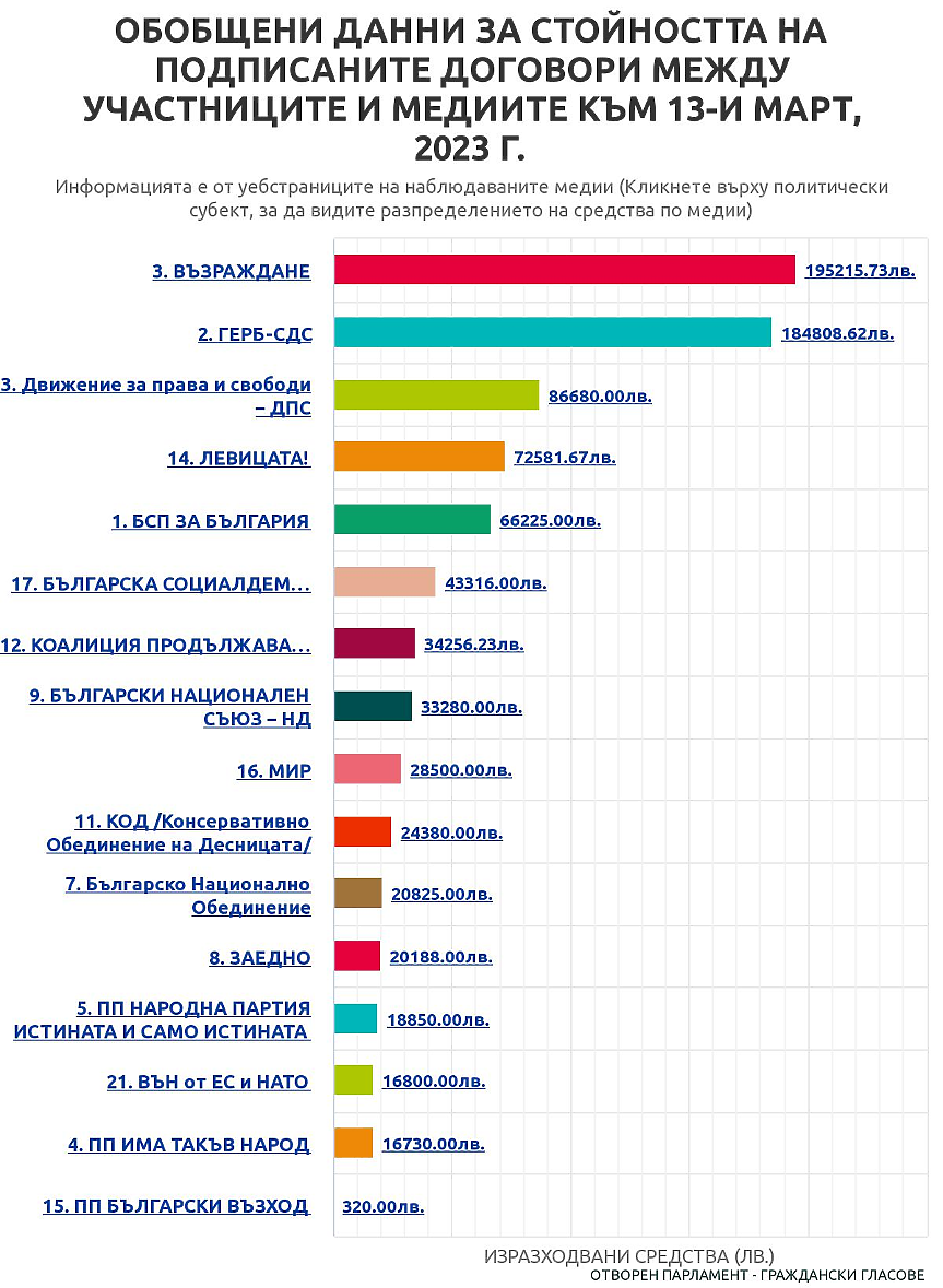 Десет дни след началото на предизборната кампания "Отворен парламент" публикува първите резултати от мониторинга с актуалност към 13 март. Подписаните договори между политическите формации и медиите възлизат на обща стойност от 862 956 лв. (без ДДС).