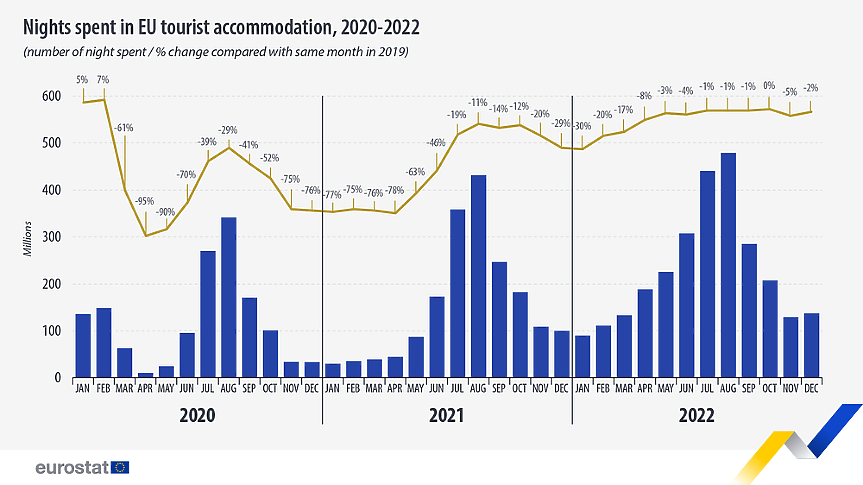 След спада, регистриран заради пандемията от COVID-19, общият брой на нощувките, прекарани в местата за туристическо настаняване в ЕС, са достигнали 2,73 милиарда през 2022 година, отчита Евростат. Тези данни бележат разлика от едва 5% спрямо броя на нощувките през предпандемичната 2019 година (2,88 милиарда нощувки). Спрямо 2021 година (1,83 милиарда нощувки) те са нараснали с 49% през 2022 година, предава БТА.