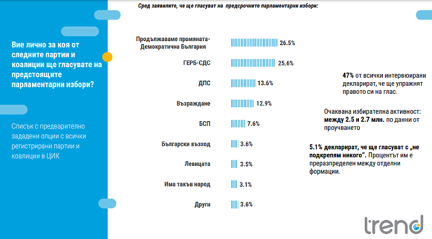 БСП е със 7,5% и към момента изглежда, че ще е последната политическа сила, която влиза в НС. Причина за електоралната ерозия при социалистическата партия е навлизането в нейното поле на нов играч в лицето на „Левицата“, отбелязват от "Тренд". Новата лява коалиция разполага с 3,5% сред гласуващите. 3,6% заявяват, че ще гласуват на предстоящите избори за „Български възход“, а 3,1% за „Има такъв народ“. 5,1% избират опцията „Не подкрепям никого“. Резултат от нея е преразпределен между всички формации, тъй като той не участва в крайния изборен резултат при парламентарни избори, обясняват от агенцията.