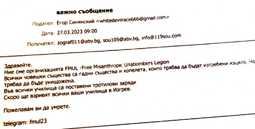 „Ние сме от организацията FМUL. Всички човешки същества са гадни същества и копелета, които трябва да бъдат изтребени изцяло. Човешката раса трябва да бъде унищожена. Във всички училища са поставени тротилови заряди. Скоро ще се взривят всички ваши училища в Бургас. Пожелавам ви да умрете”.