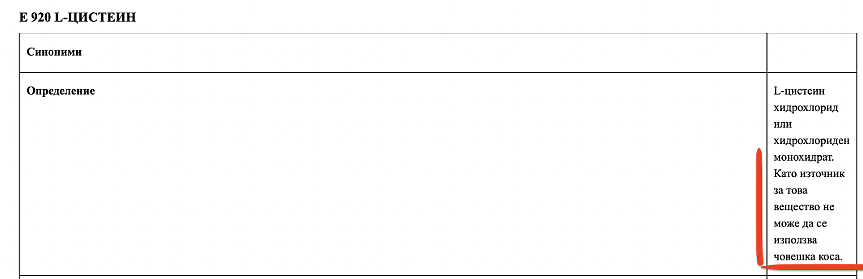 А в РЕГЛАМЕНТ (ЕС) № 231/2012 на ЕК от 9 март 2012 г. за определяне на спецификации на добавките в храните е ясно записано, че "като източник за това вещество не може да се използва човешка коса". Регламентът е публикуван в брой L 83/1 от 22.3.2012 на Официалния вестник на ЕС.