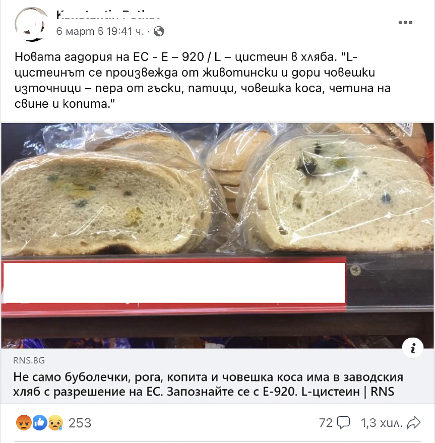 От началото на март т.г. във фейсбук широко се разпространява твърдение за наличие в хляба на аминокиселината L-цистеин, която се произвежда от животински и човешки източници - пера и коса. Към 20 март публикацията е споделена над 1300 пъти, сочи редовната рубрика на БНР за проврка на факти - Factcheck.