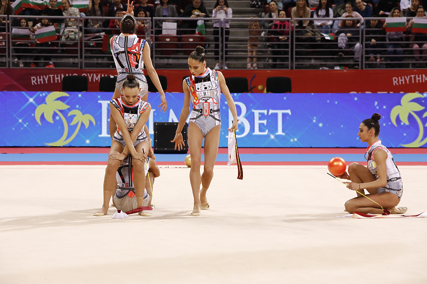 Момичетата на Весела Димитрова стъпиха на първото място, след като изиграха блестящо композицията си с три ленти и две топки, а оценката от 32.700 точки ги изкачи до върха в класирането, съощава БНР.