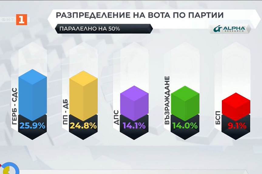 Според паралелно преброяване на 100% на "Алфа рисърч" ГЕРБ-СДС заема първото място след изборите, но с минимална преднина. С по-малко от процент след тях е коалицията "Продължаваме промяната - Демократична България", като по-скоро може да се говори за паритет.