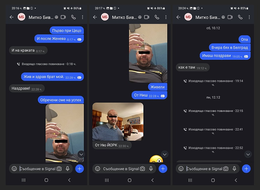 В самите чатове, за които е използвано приложението Signal (популярно заради криптирането на съобщенията), се вижда, че човек, който прилича на Дилиян Георгиев си праща снимки с "наздраве" с чашка с друг, който вероятно е Димитър Стоянов.