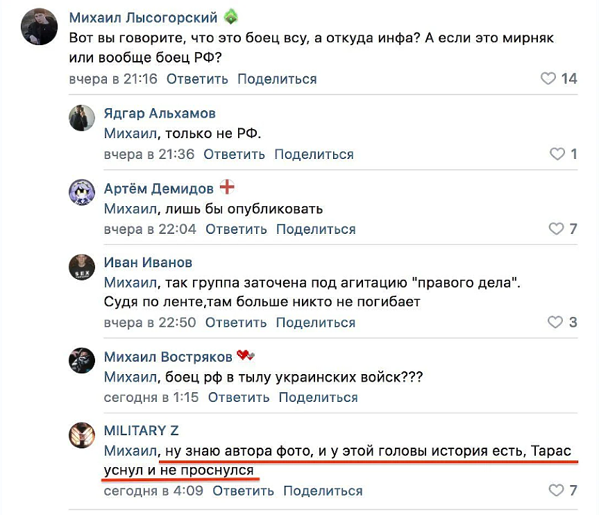 В коментарите отдолу потребителите попитаха къде са доказателствата, че това не е главата на руски окупатор или цивилен в Бахмут. Авторът на публикацията отговори, че се познава лично с фотографа и че този череп има "история".