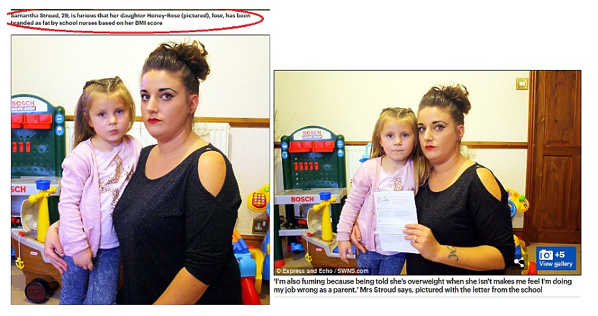 Обратно търсене на изображението на майката и детето, използвани в българските публикации, отвежда до статия от 2016 г. в електронното издание на британския в. "Дейли мейл", в която е описан случай на майка, чието 4-годишно дете е определено от училищна медицинска сестра за затлъстяло. На снимката е 29-годишната Саманта Страуд и дъщеря ѝ Хъни-Роуз, които нямат нищо общо с дете и майка от Разград. Действието се развива в началната академия Brixington в Девън – Югозападна Великобритания. На изображението е заснета жената с писмото, което е получила от училището.