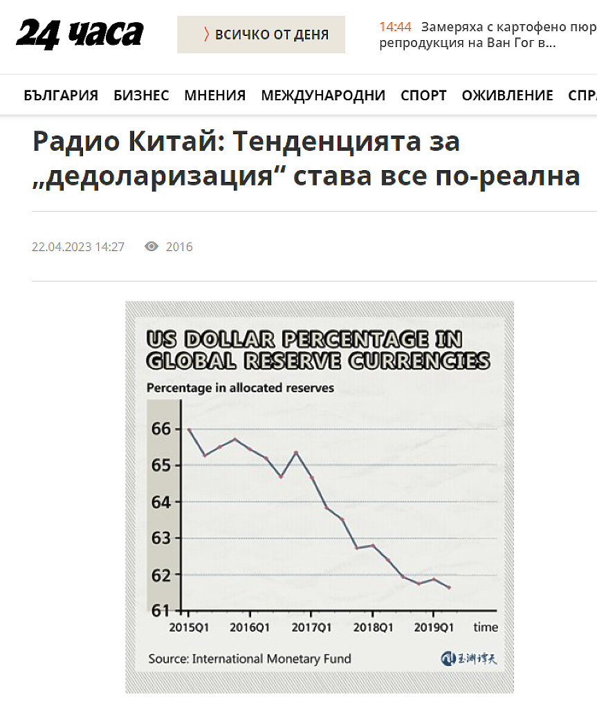 Този път обаче Кремъл не е сам. По въпроса активно работи и китайската държавна пропаганда, която се стреми да преувеличава степента на „дедоларизация“ в световната икономика.