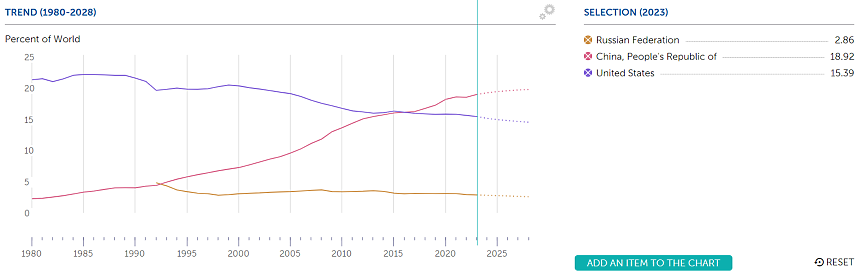 Само че големият играч в случая не е Русия, а Китай. Делът на Китай в световната икономика наближава една пета, докато този на САЩ е малко над 15%. Това нараснало присъствие и влияние дават на Пекин самочувствието да предизвика Вашингтон и вече открито да говори за „дедоларизация“ и „юанизация“.