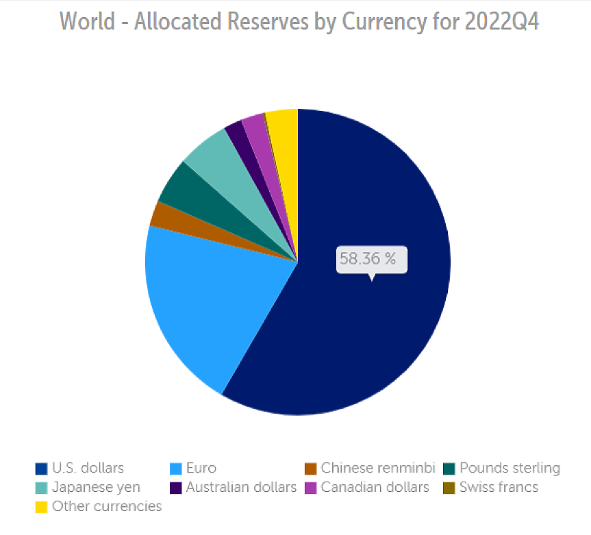 По данни на МВФ към края на 2022 г. над 58% от световните валутни резерви са в долари. Една пета са в евро, близо 5% в британски лири, а 2,69% в китайски юани (ренминби).