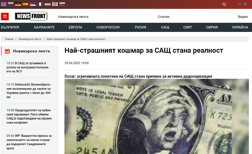 По данни, събрани чрез системата за медиен мониторинг „Сенсика“, за една година (30 април 2022 – 30 април 2023) най-много публикации (110) по темата за „дедоларизацията“ има в сайта Novini247 – рекордьорът по отразяване на руска пропаганда за войната в Украйна според изследването на екипа на Фондация за социални и хуманитарни изследвания.