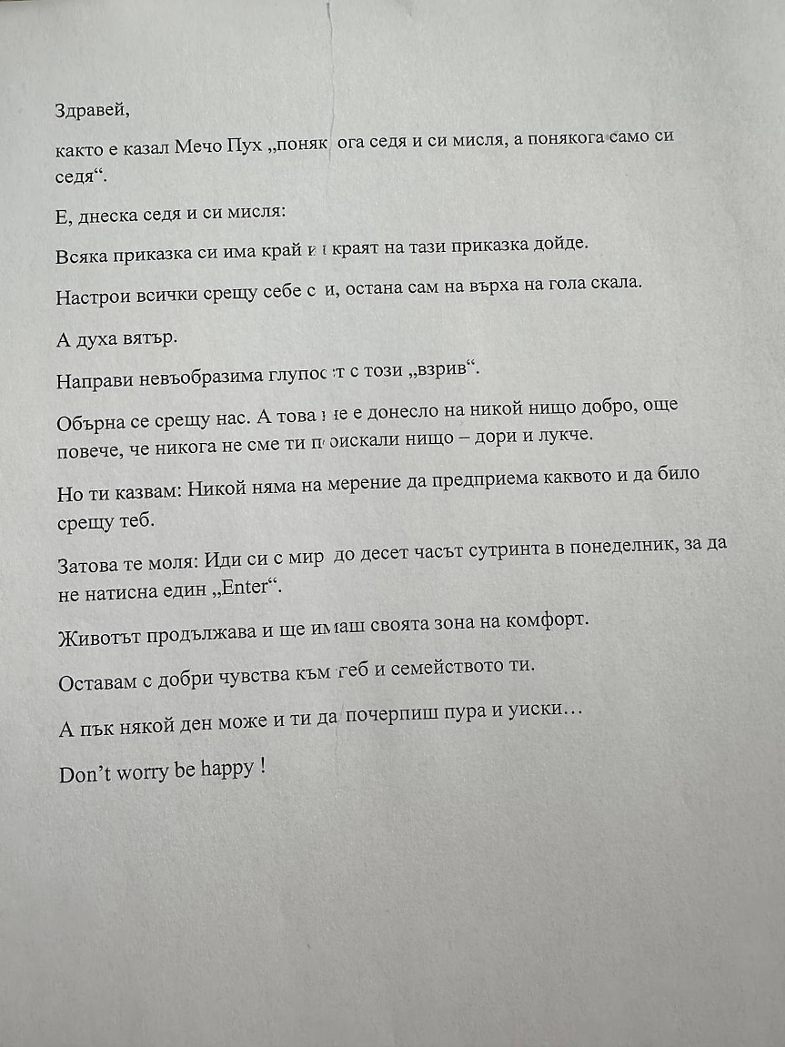 - И подай там молба да бъдеш преназначен във ВАП. А това ще е, щото да не се събирате със Сотир на едно място. (После близки медии до Гешев "сглобиха" оставката му и там наистина пише, че иска преместване в административната прокуратура, б.р.)