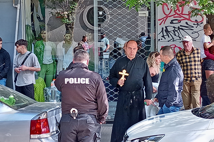 На място е и човек, който се облича като православен свещеник и в началото на седмицата бе изведен от полицията пред президентството, където се затича към Кирил Петков, при връщането на мандата.