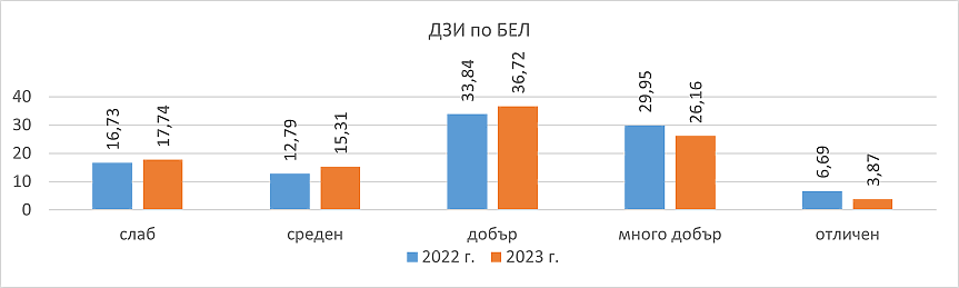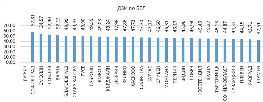 Запазва подредбата на регионите с най-добри резултати от ДЗИ по БЕЛ. Първите пет са София-град, Смолян, Пловдив, Варна и Благоевград. Последни по резултати са областите Шумен, Разград, Плевен, Пазарджик и София-област, отчитат от МОН.