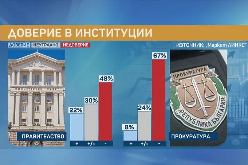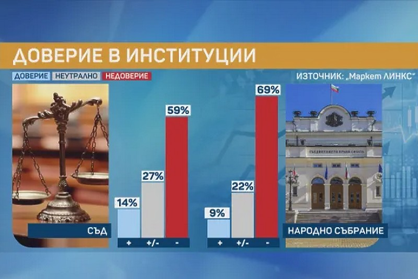 Ниско е доверието и в прокуратурата, съда и Народното събрание – съответно 8%, 14% и 9%.