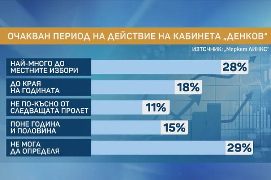 Очакванията на обществото са, че животът на кабинета „Денков“ ще бъде кратък. Едва 15% смятат, че той ще продължи в планирания срок от година и половина.