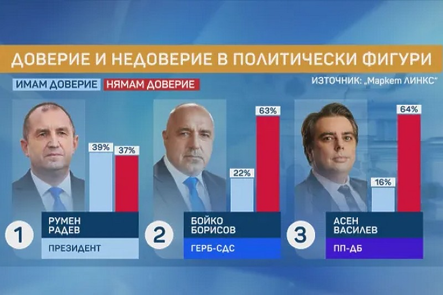 Президентът Румен Радев продължава да поддържа най-високо доверие – 29 на сто, следван от лидера на ГЕРБ Бойко Борисов с 22% и финансовия министър Асен Василев с 16%.