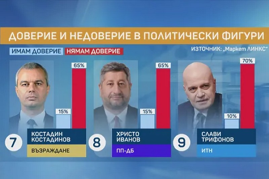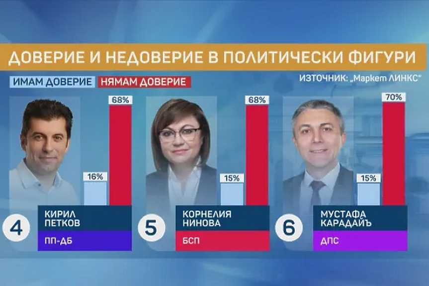 Доверието във всички останали лидери на политическите сили е между 10 и 16 на сто.