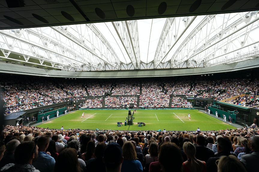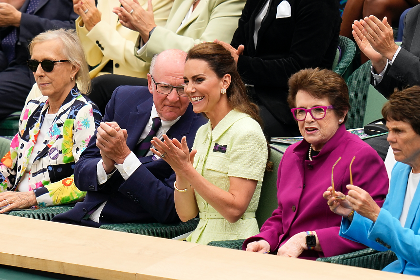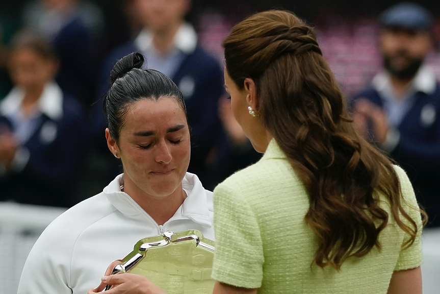 И двете тенисистки по традиция бяха връчени от принцесата на Уелс - Кейт Мидълтън (горе). Мъжкият финал между шампиона Новак Джокович и Карлос Алкарас е в неделя.