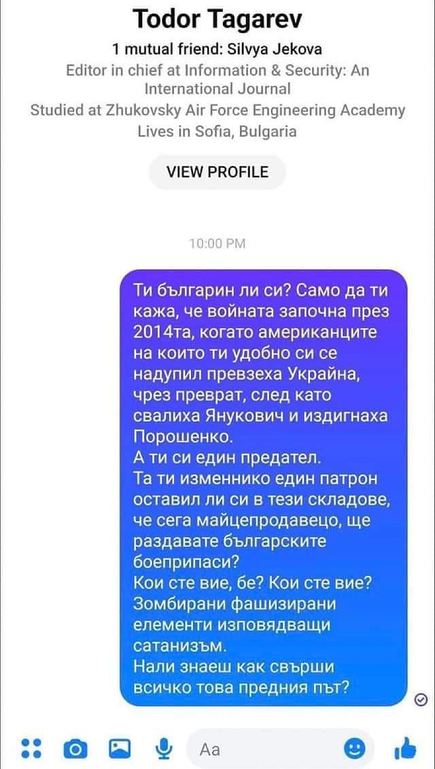 Стана ясно и че Тодор Тагарев се ядосал и е подал сигнал в МВР. В обясненията си министърът на отбраната казал, че и друг път е получавал подобни съобщения, цитира го БНР.