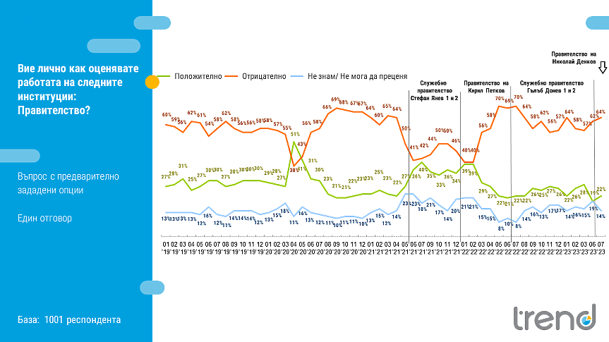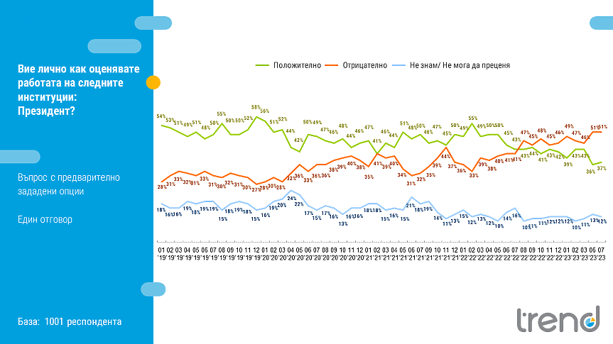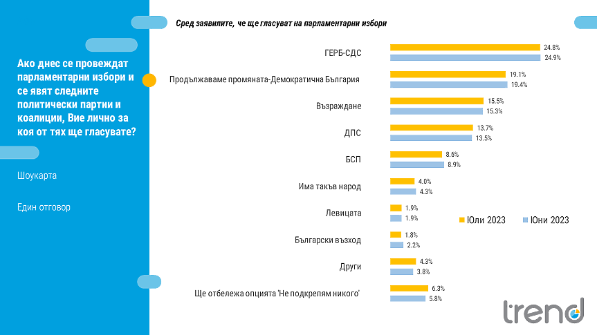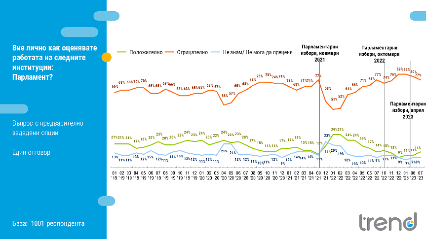 Това показват данни от национално представително проучване на изследователски център "Тренд", посветено на нагласите на българите спрямо основните институции и партиите. Изследването е реализирано в периода между 4 и 11 юли 2023 г. чрез пряко полустандартизирано интервю "лице в лице" с таблет сред 1001 души на възраст 18+ и е по поръчка на вестник "24 часа".