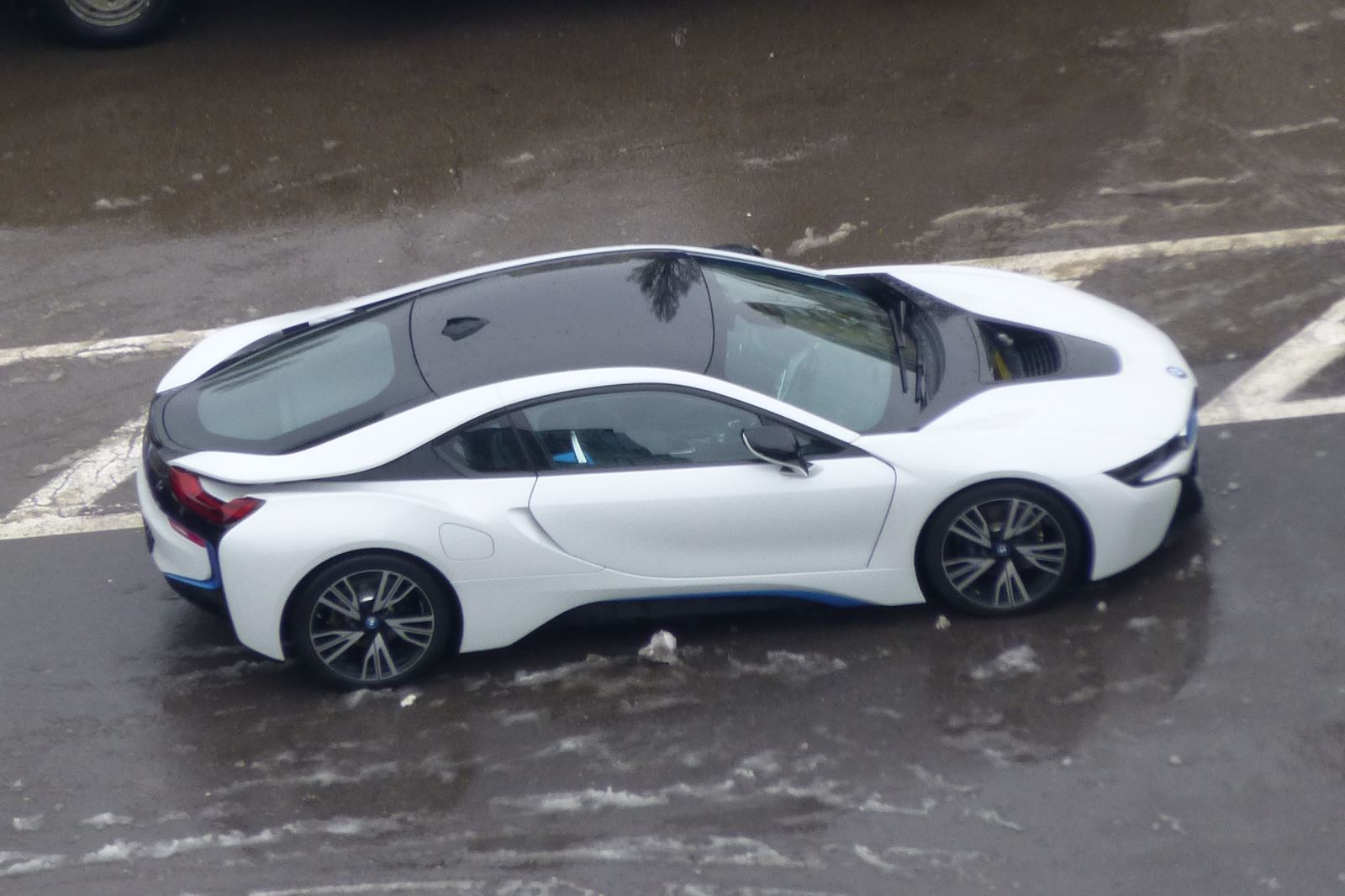 Това е хибридът BMW i8, с електродвигател отпред и бензинов мотор отзад.